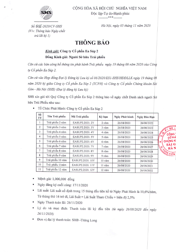 Thông báo Về việc chốt danh sách Người sở hữu Trái phiếu để thực hiện việc trả lãi Trái phiếu Công ty Cổ phần Ea Sup 2