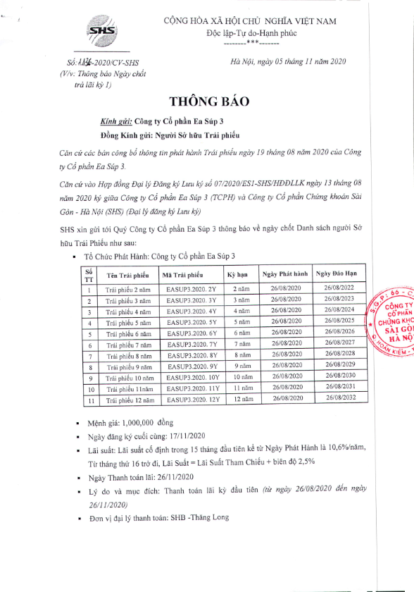 Thông báo Về việc chốt danh sách Người sở hữu Trái phiếu để thực hiện việc trả lãi Trái phiếu Công ty Cổ phần Ea Sup 3