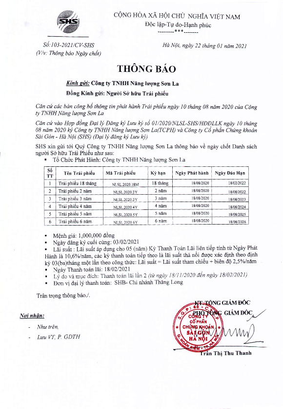Thông báo Về việc chốt danh sách Người sở hữu Trái phiếu để thực hiện việc trả lãi Trái phiếu Công ty TNHH Năng Lượng Sơn La