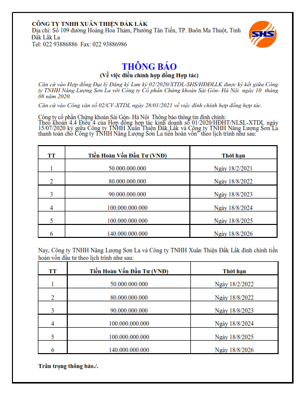 - Thông báo Về việc đính chính hợp đồng hợp tác Công ty TNHH Năng Lượng Sơn La - 01/02/2021