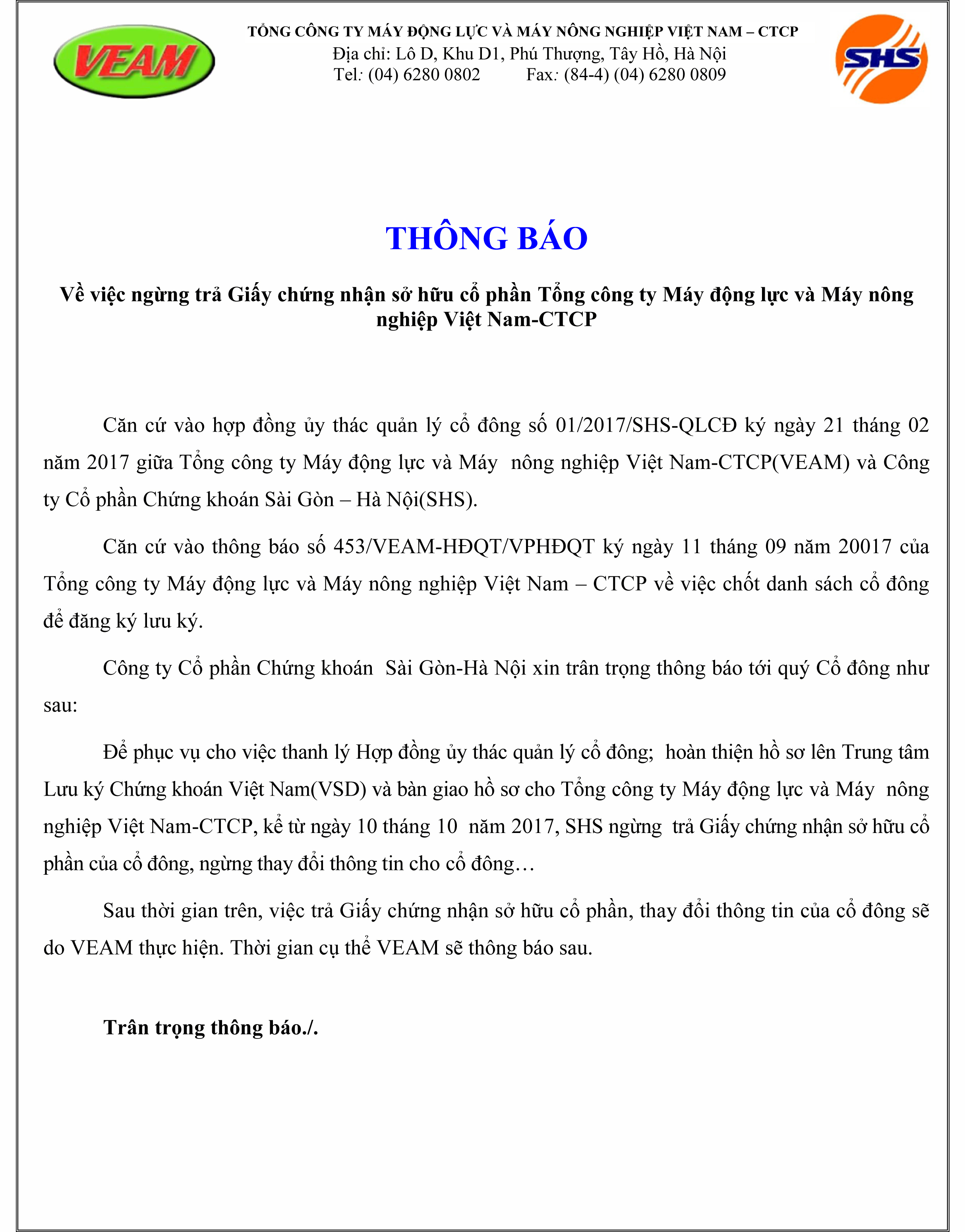 - VEAM: Thông báo về việc ngừng trả Giấy chứng nhận sở hữu cổ phần Tổng công ty Máy động lực và Máy nông nghiệp Việt Nam - CTCP - 10/10/2017