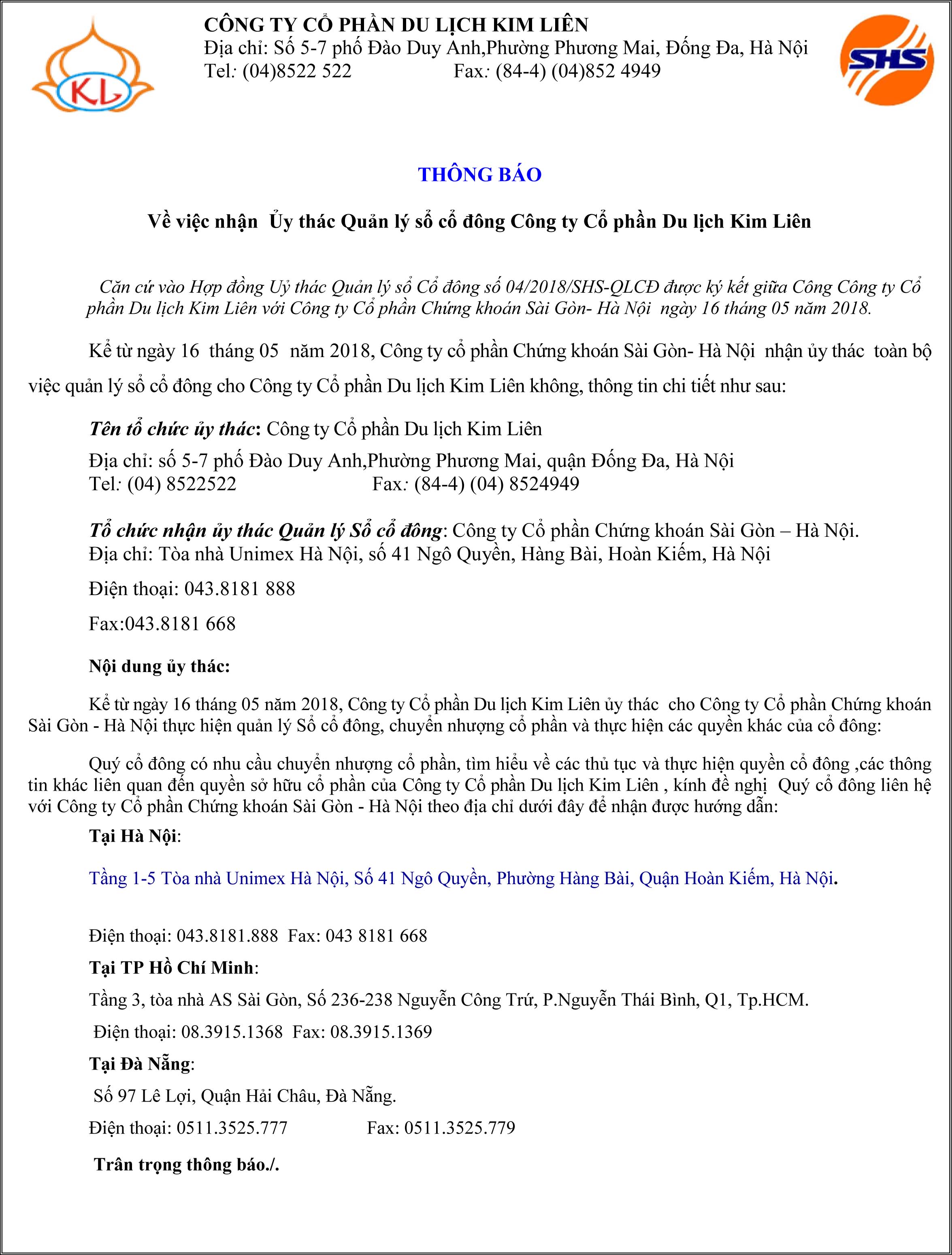 Thông báo về việc nhận Ủy thác Quản lý sổ cổ đông Công ty Cổ phần Du lịch Kim Liên