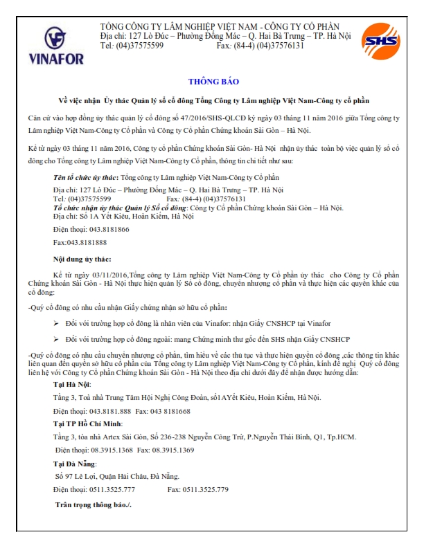 Thông báo về việc nhận Ủy thác Quản lý sổ cổ đông Tổng Công ty Lâm nghiệp Việt Nam-Công ty cổ phần
