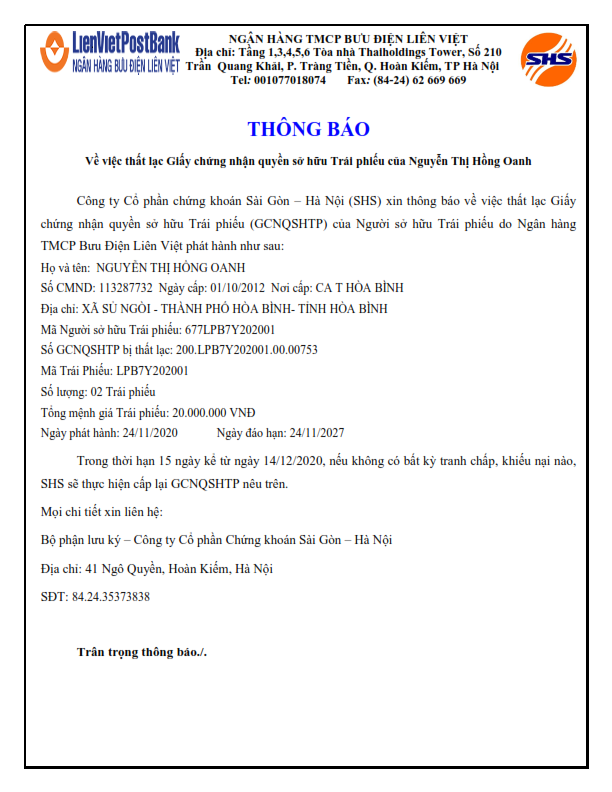 Thông báo Về việc thất lạc Giấy chứng nhận quyền sở hữu Trái phiếu của Nguyễn Thị Hồng Oanh