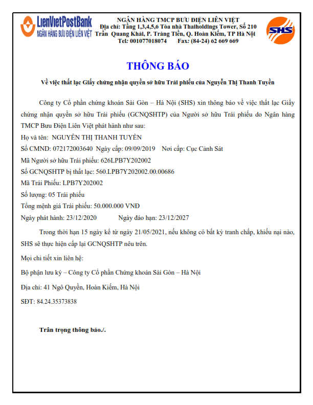 - Thông báo Về việc thất lạc Giấy chứng nhận quyền sở hữu Trái phiếu của Nguyễn Thị Thanh Tuyền - 21/05/2021