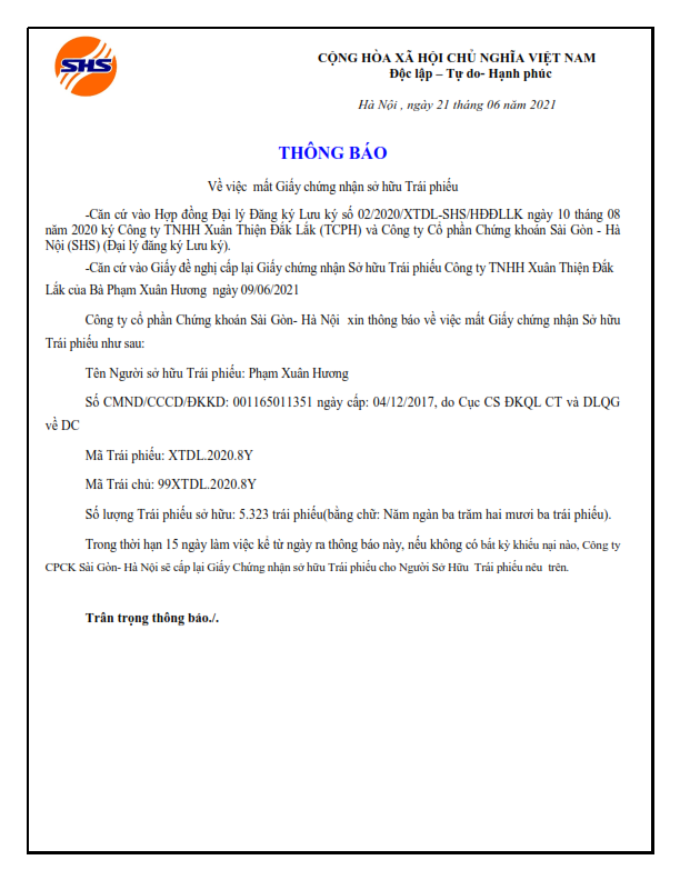 - Thông báo Về việc chốt danh sách Người sở hữu Trái phiếu để thực hiện Trả lãi kỳ 4 cho Công ty TNHH Xuân Thiện Đắk Lắk - 27/07/2021