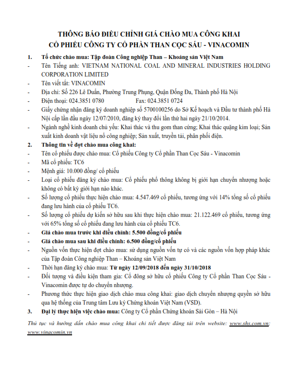 Vinacomin: Thông báo điều chỉnh giá chào mua công khai cổ phiếu CTCP Than Cọc 6