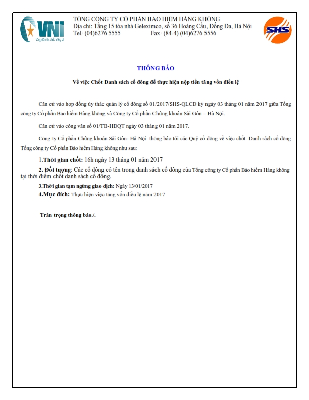 - VNI: Thông báo về việc nhận Ủy thác Quản lý sổ cổ đông Tổng Công ty Cổ phần Bảo hiểm Hàng không - 18/01/2017