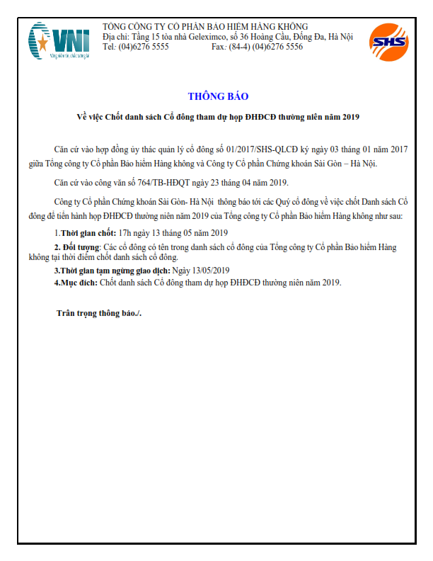 VNI: Thông báo về việc Chốt danh sách Cổ đông để tiến hành họp ĐHĐCĐ thường niên 2019