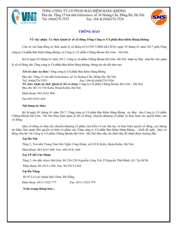 VNI: Thông báo về việc nhận Ủy thác Quản lý sổ cổ đông Tổng Công ty Cổ phần Bảo hiểm Hàng không