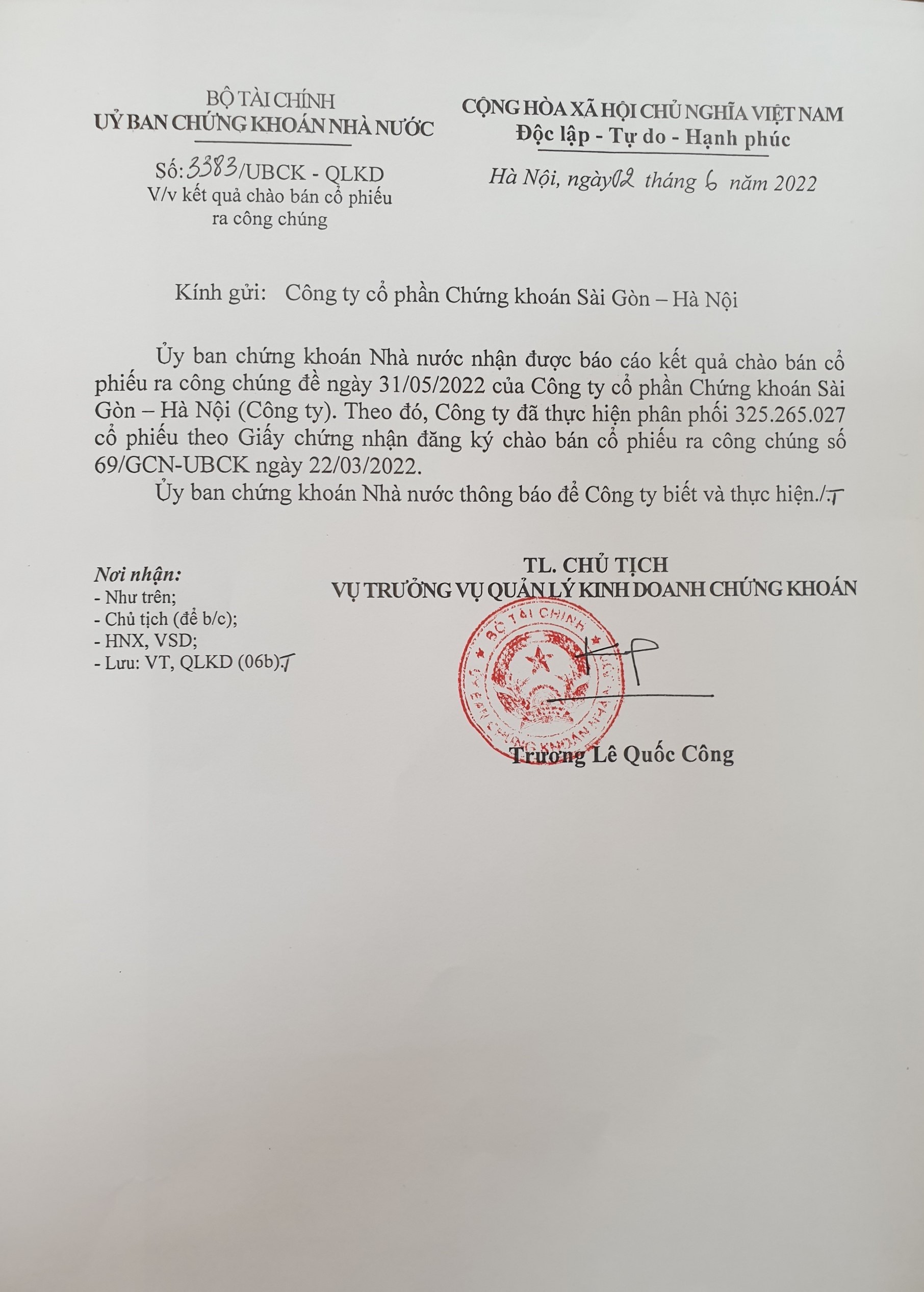 Công ty CP Chứng khoán Sài Gòn – Hà Nội trân trọng công bố toàn văn Công văn số 3383/UBCK-QLKD của UBCKNN chấp thuận Báo cáo kết quả chào bán CP SHS ra công chúng năm 2022 của SHS