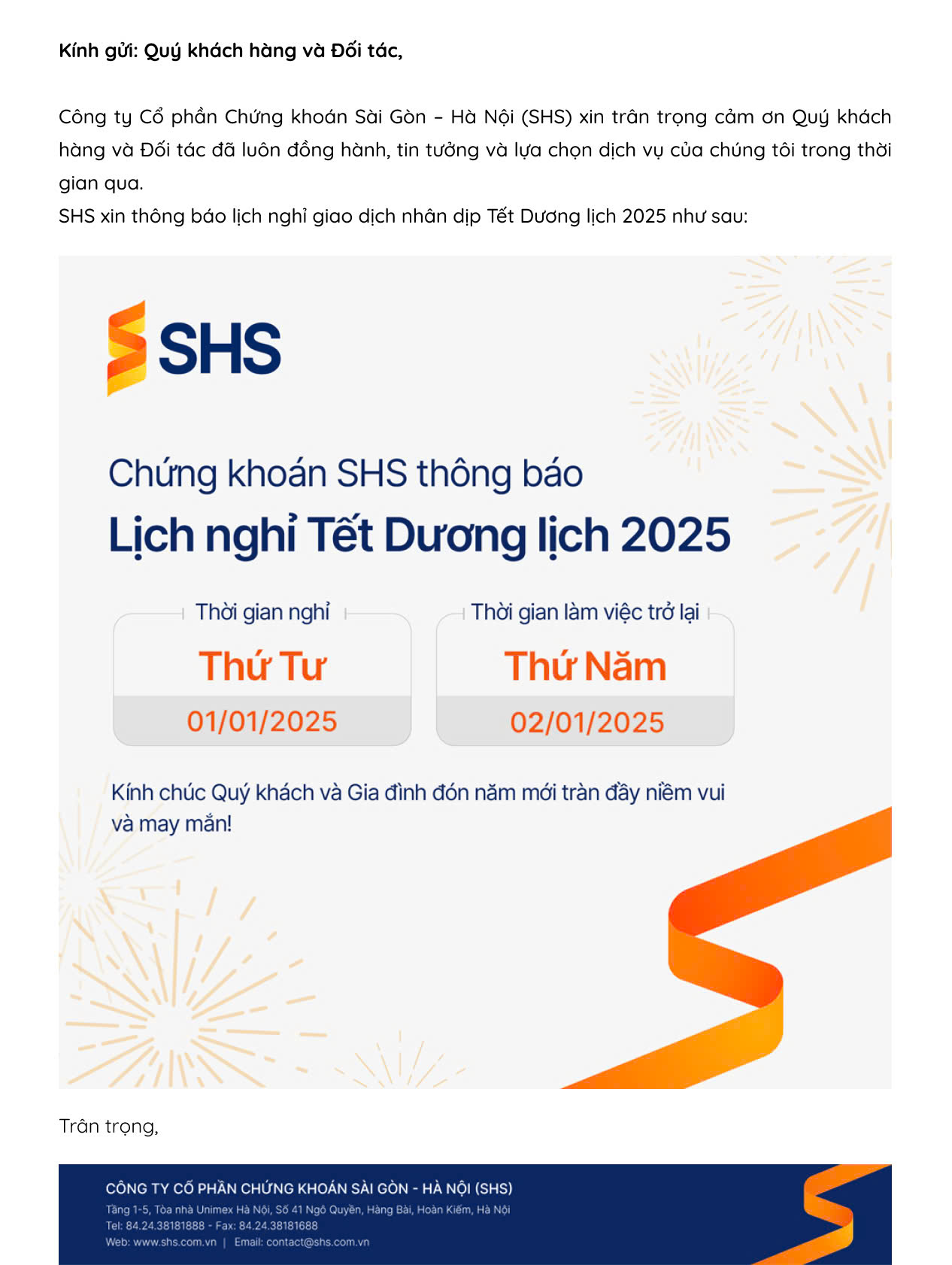 Chứng khoán SHS thông báo lịch nghỉ Tết Dương lịch 2025