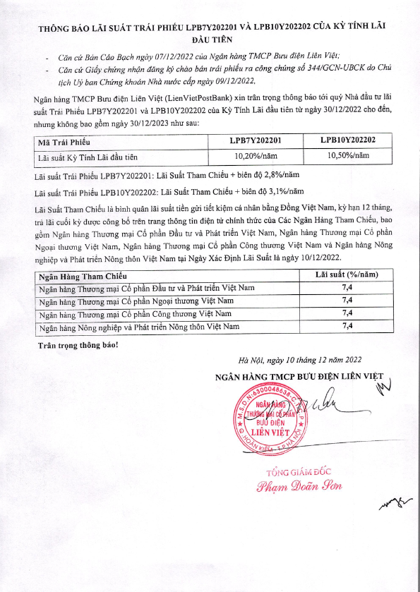 LIENVIETPOSTBANK: THÔNG BÁO LÃI SUẤT TRÁI PHIẾU LPB7Y202201 VÀ LPB10Y202202 CỦA KỲ TÍNH LÃI ĐẦU TIÊN
