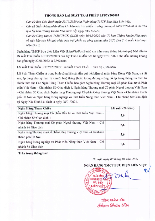 LPB: Thông báo lãi suất trái phiếu LPB7Y202003 đợt 3