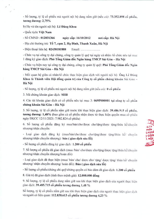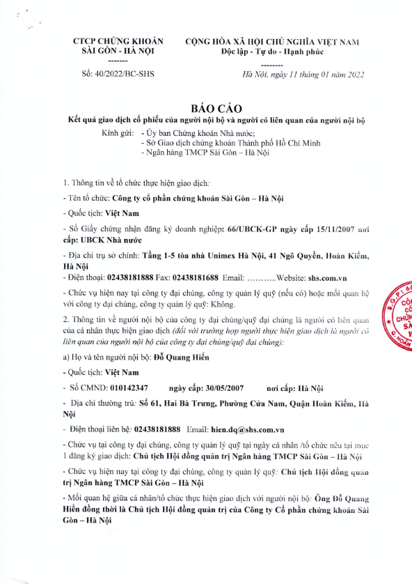 SHS: Báo cáo kết quả giao dịch cổ phiếu của người có liên quan đến người nội bộ