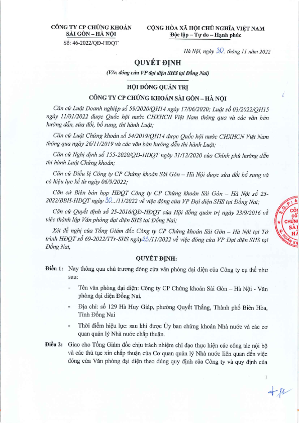 SHS: CBTT Quyết định của HĐQT về việc đóng cửa Văn phòng đại diện của SHS tại Đồng Nai