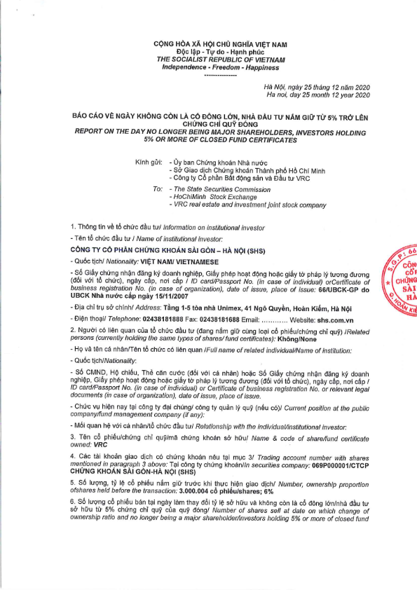 SHS: CBTT về việc SHS không còn là cổ đông lớn của VRC