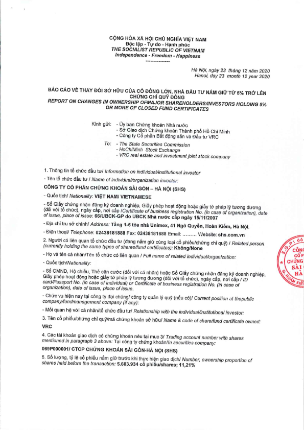 - SHS: CBTT về việc SHS không còn là cổ đông lớn của VRC