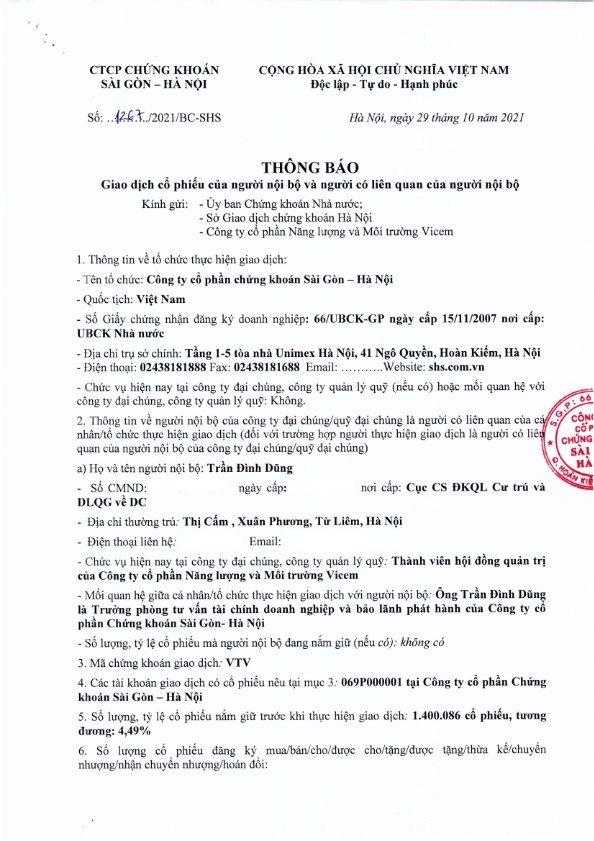 - SHS được Cấp GCN ĐKCK thay đổi lần 4, Cổ phiếu SHS PHT được lưu ký từ 02/11/2021