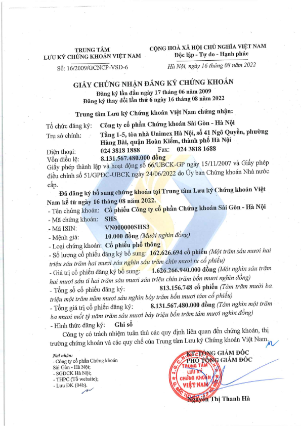 SHS công bố Giấy chứng nhận đăng ký chứng khoán số 16/2009/GCNCP-VSD-6 do VSD cấp ngày 16/08/2022
