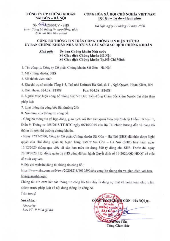 SHS: Công bố thông tin về giao dịch với Bên liên quan - SHB