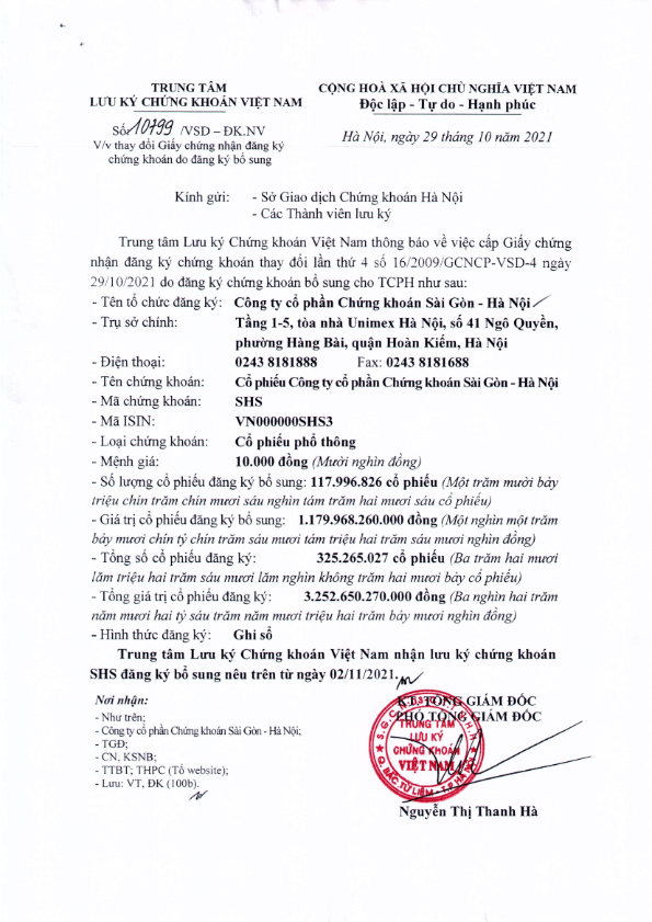 SHS được Cấp GCN ĐKCK thay đổi lần 4, Cổ phiếu SHS PHT được lưu ký từ 02/11/2021