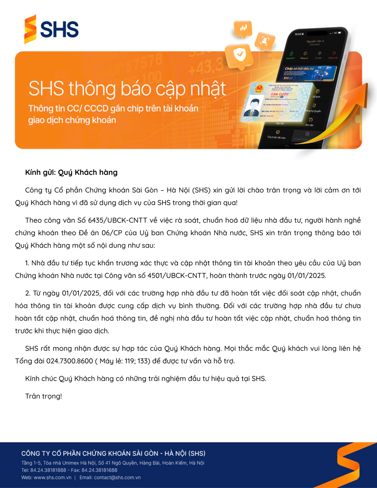 SHS: Thông báo cập nhận thông tin CC/CCCD gắn chip trên tài khoản giao dịch chứng khoán