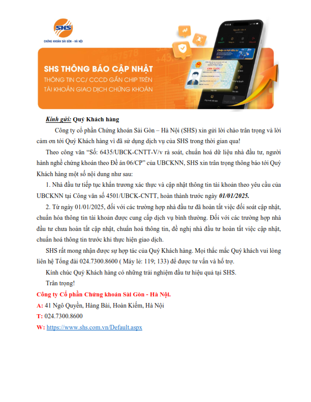 SHS Thông báo cập nhật thông tin CC/CCCD gắn chip trên tài khoản giao dịch chứng khoán