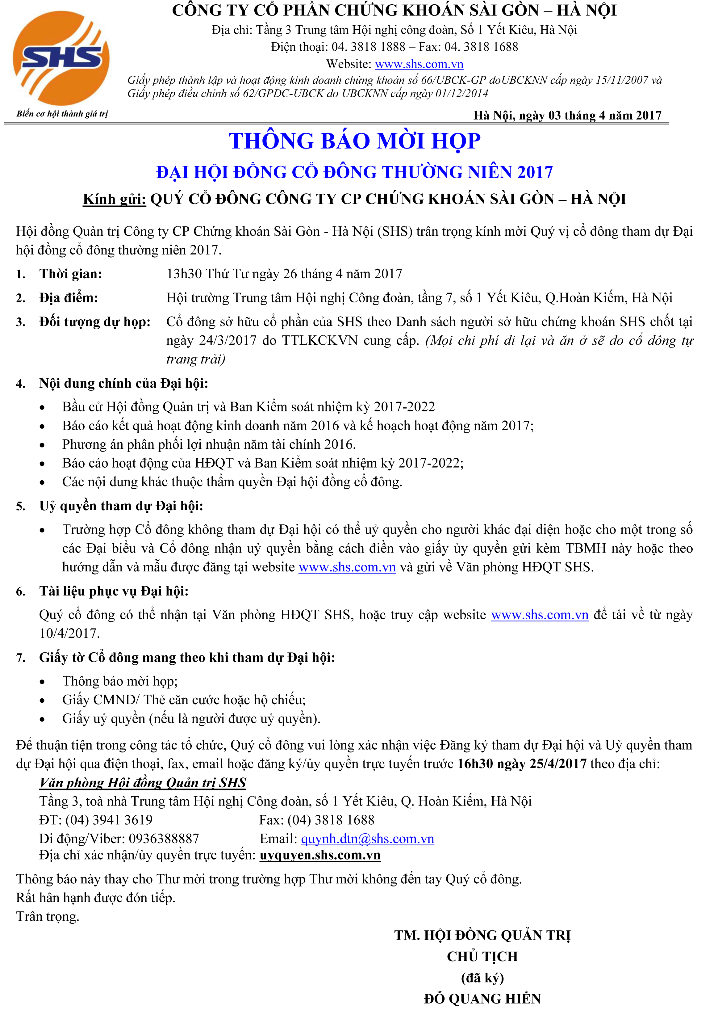 - SHS: Đại hội đồng cổ đông thường niên năm 2017