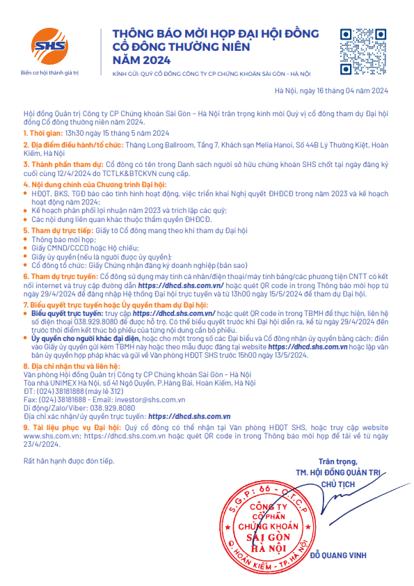 SHS thông báo mời họp Đại hội đồng cổ đông thường niên 2024