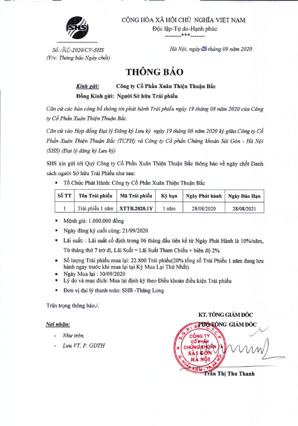SHS: Thông báo về ngày chốt danh sách người sở hữu trái phiếu CTCP Xuân Thiện Thuận Bắc