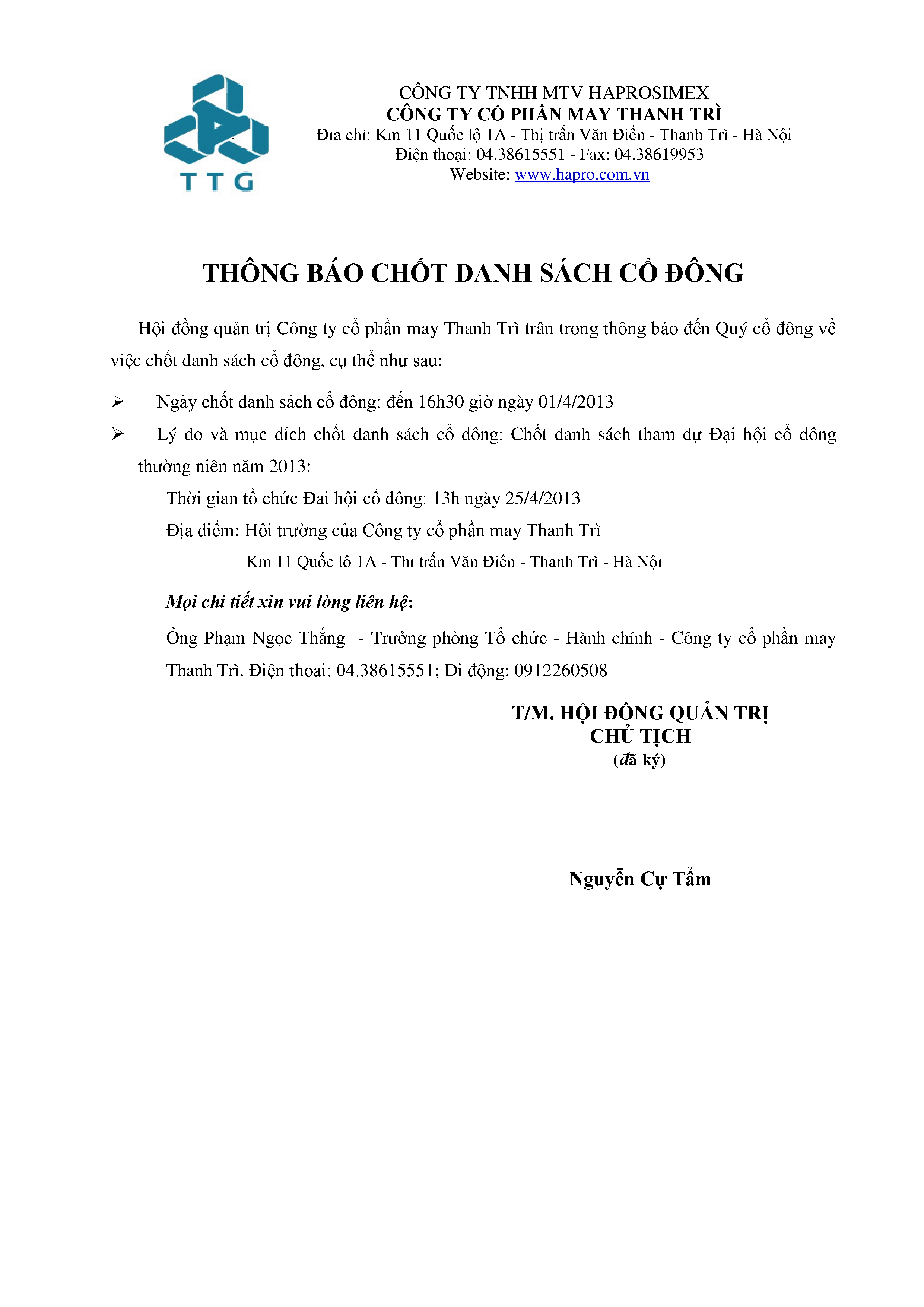 Thông báo chốt danh sách cổ đông của Công ty cổ phần May Thanh Trì.