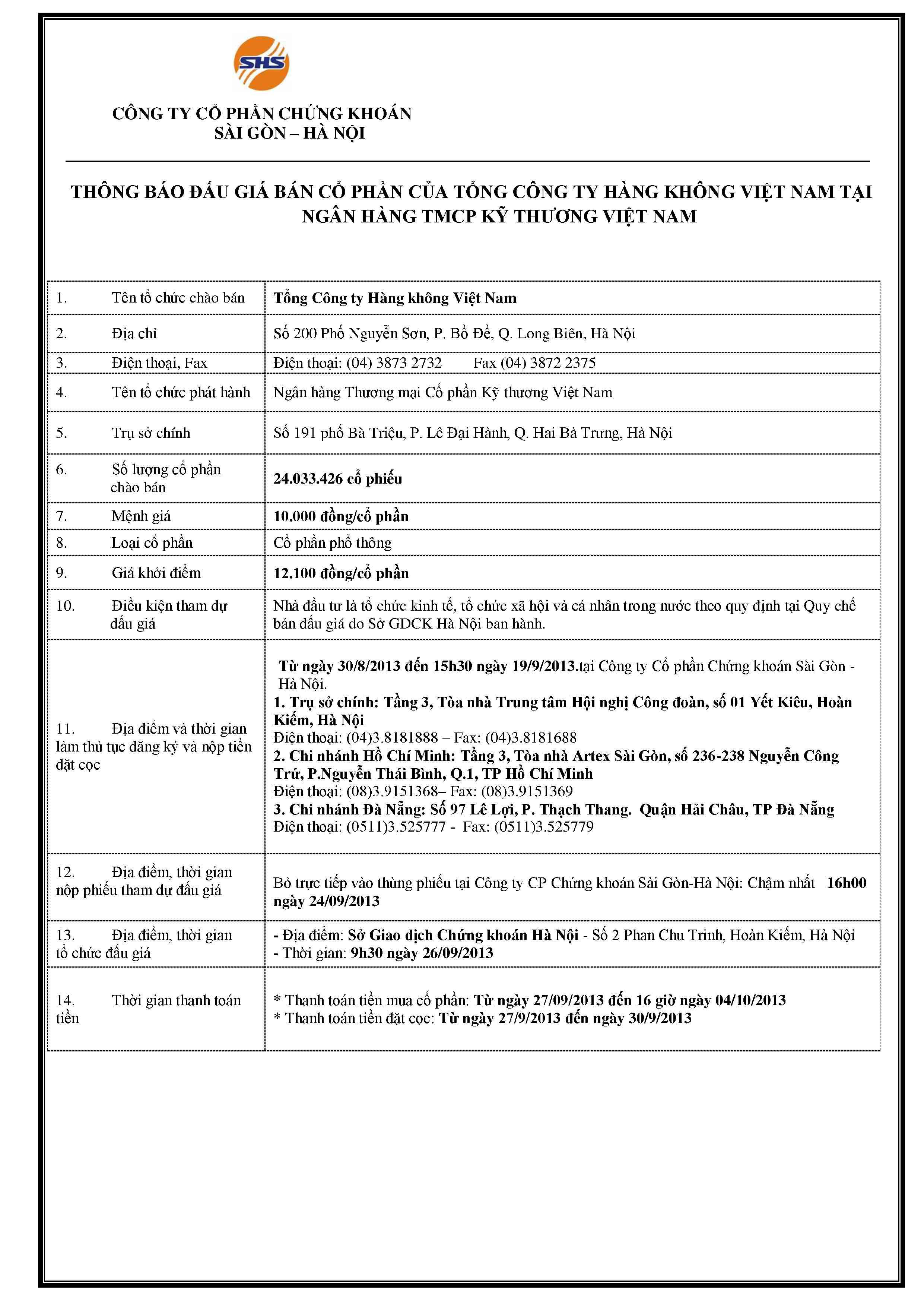 Thông báo đấu giá bán cổ phần của Tổng công ty hàng không Việt Nam tại ngân hàng TMCP Kỹ thuơng Việt Nam