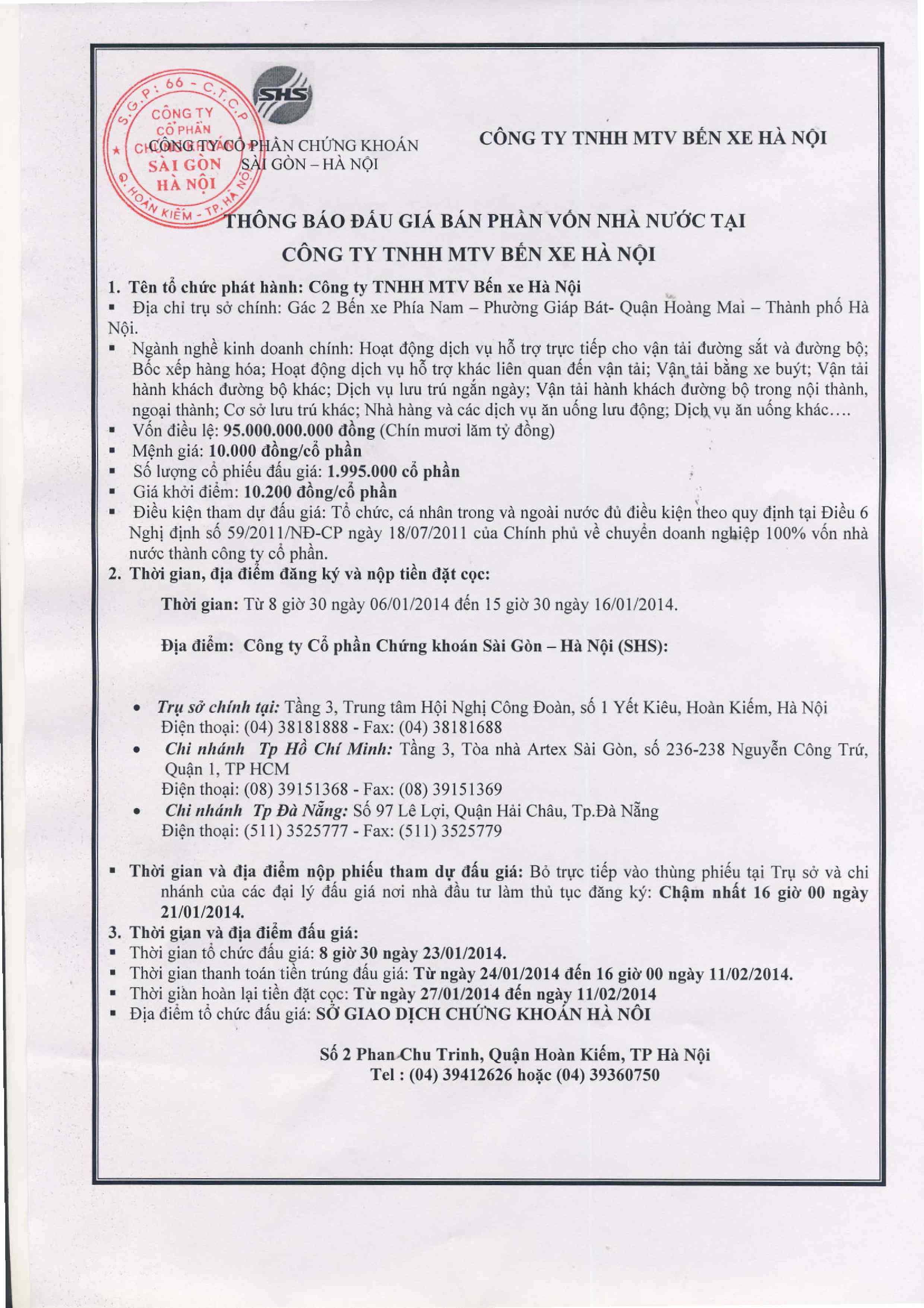 Thông báo đấu giá bán phần vốn nhà nuớc tại Công ty TNHH MTV bến xe hà nội