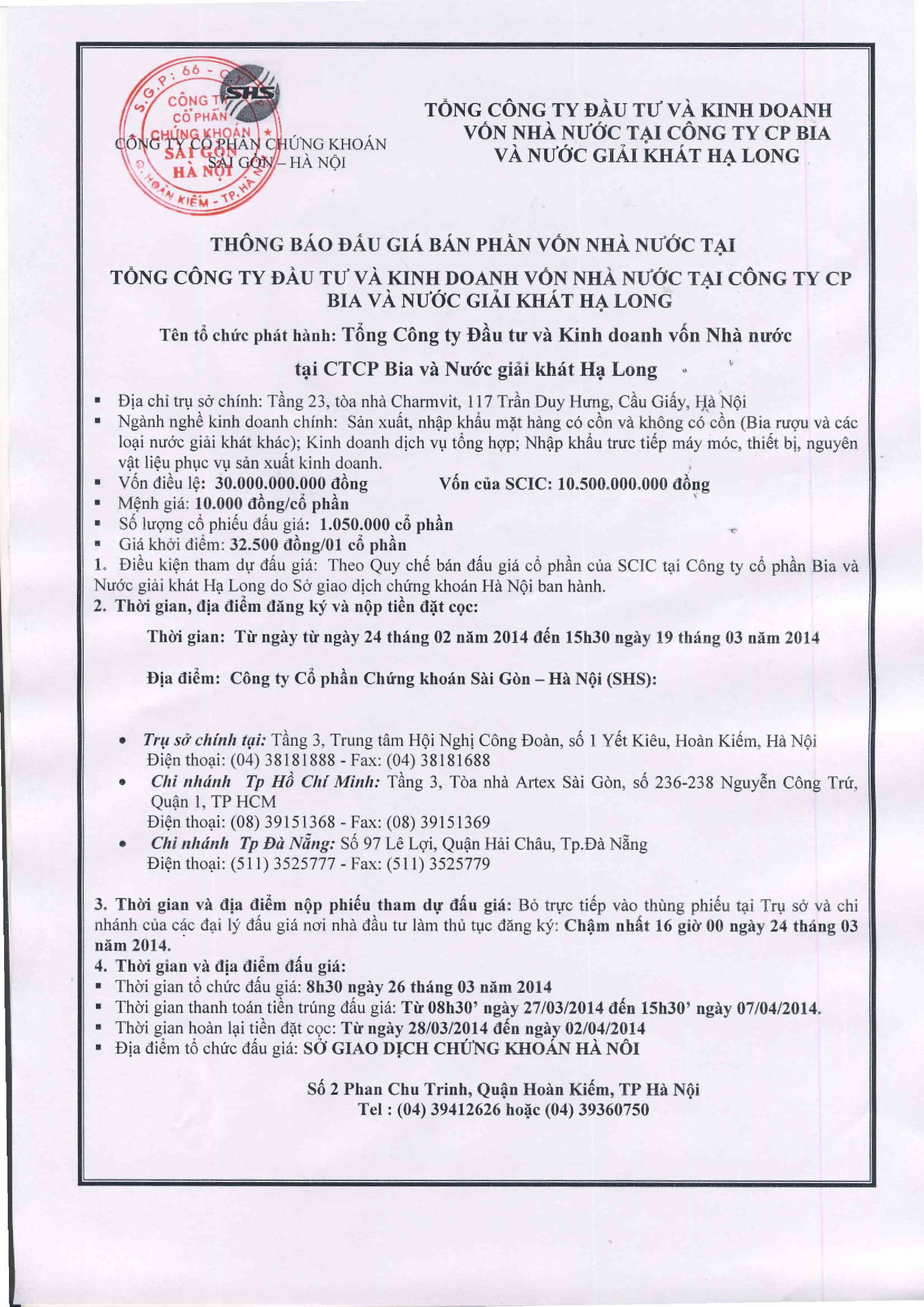 Thông báo đấu giá bán phần vốn nhà nước tại Tổng Công ty Đầu tư và Kinh doanh vốn Nhà nước tại CTCP Bia và Nước giải khát Hạ Long
