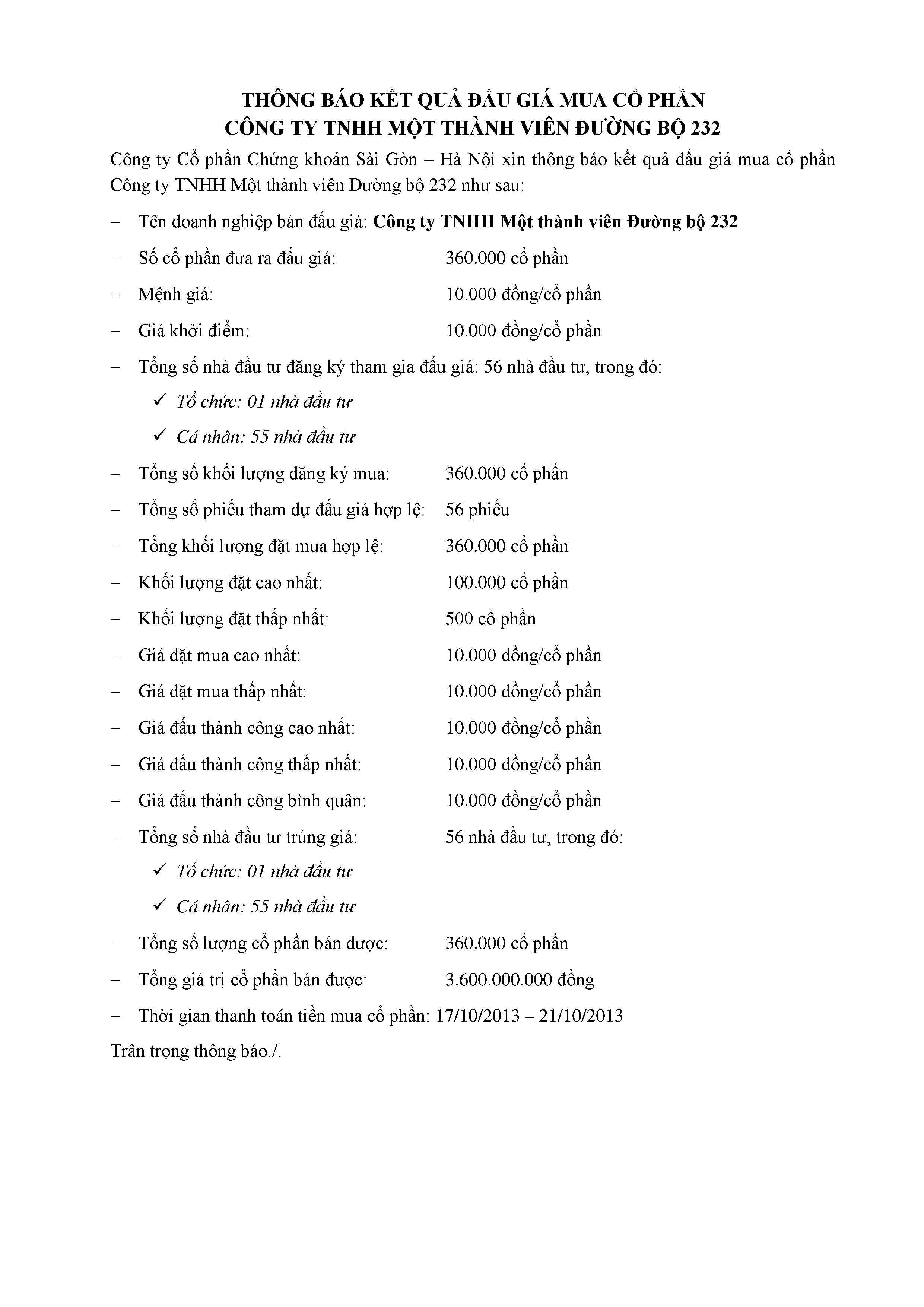 Thông báo kết quả đấu giá mua cổ phần Công Ty TNHH Một Thành Viên Đường bộ 232
