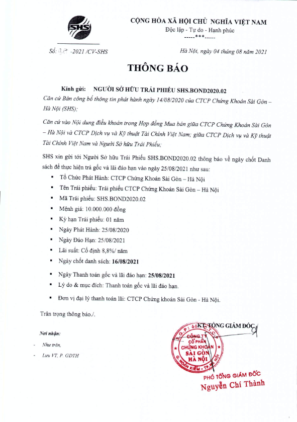 - Thông báo về ngày chốt trả lãi lần 2 Trái phiếu SHS.BOND2020.03