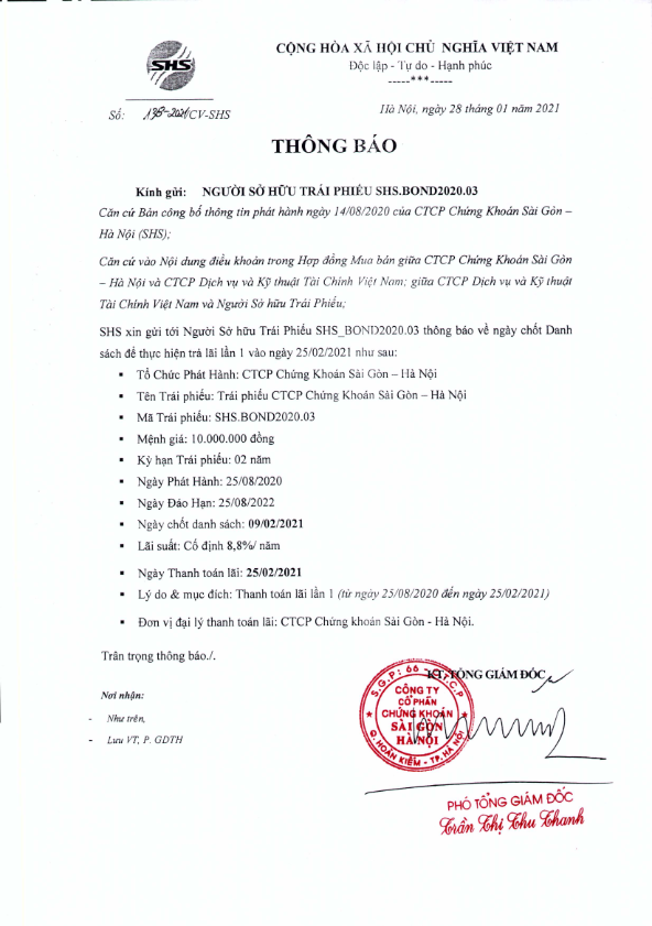 - Thông báo về ngày chốt dánh sách để thực hiện trả lãi lần 1 trái phiếu SHS_BOND2020.02