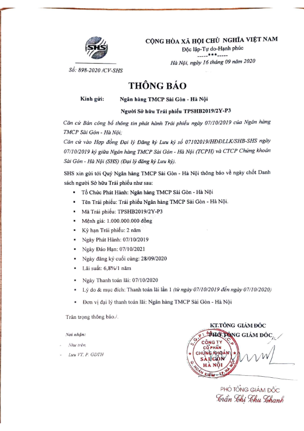 Thông báo về Ngày chốt và ngày thanh toán lãi Trái Phiếu TPSHB2019/2Y-P3