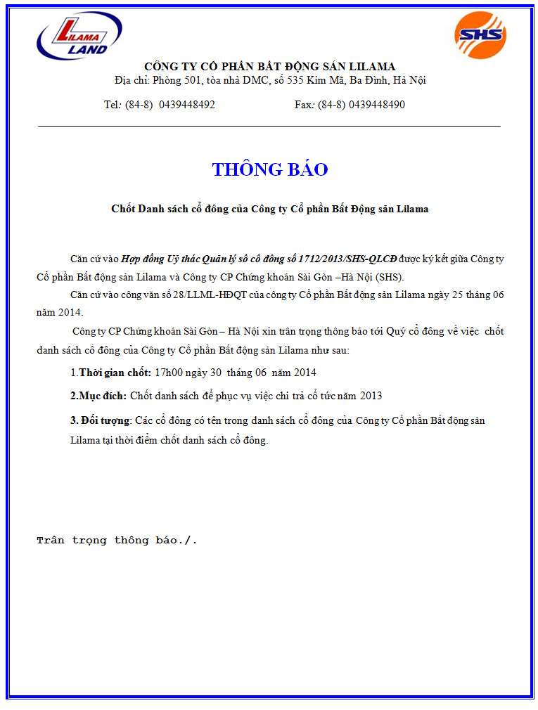 Thông báo về việc chốt danh sách cổ đông của Công ty Cổ phần Bất Động sản Lilama