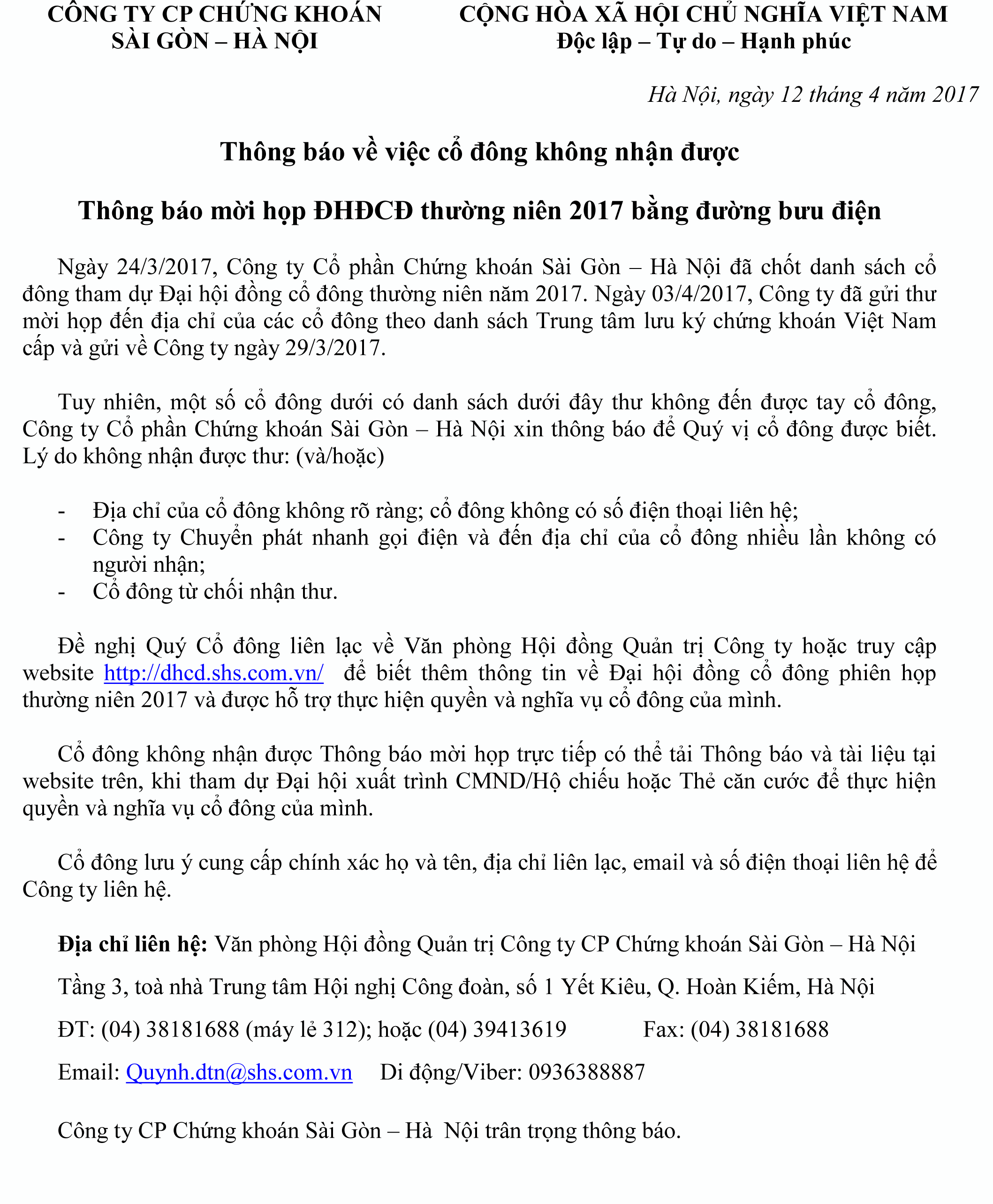 - SHS thông báo mời họp Đại hội đồng cổ đông thường niên 2017