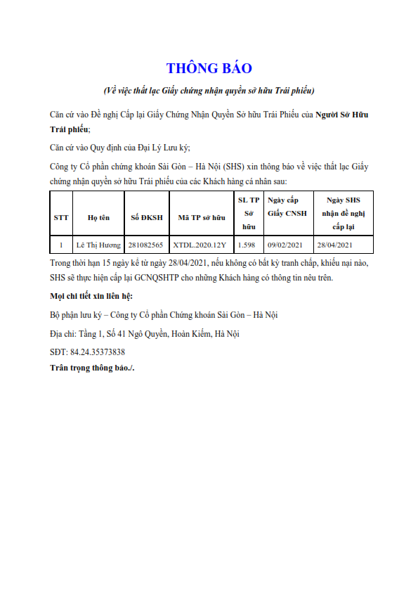 Thông báo về việc thất lạc giấy chứng nhận quyền sở hữu trái phiếu của Lê Thị Hương