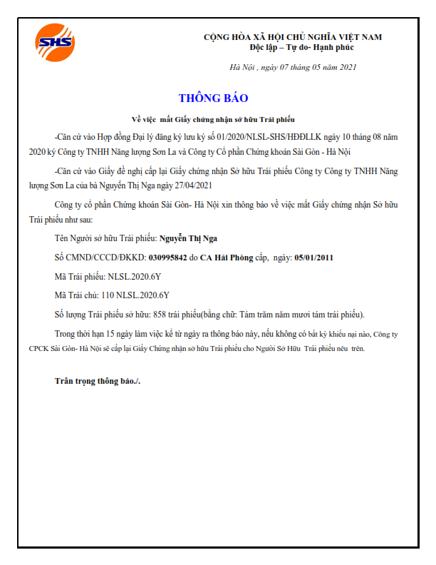 Thông báo về việc thất lạc giấy chứng nhận quyền sở hữu trái phiếu của Nguyễn Thị Nga
