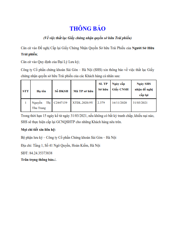 - Thông báo về việc thất lạc Giấy Chứng nhận Quyền Sở hữu Trái phiếu