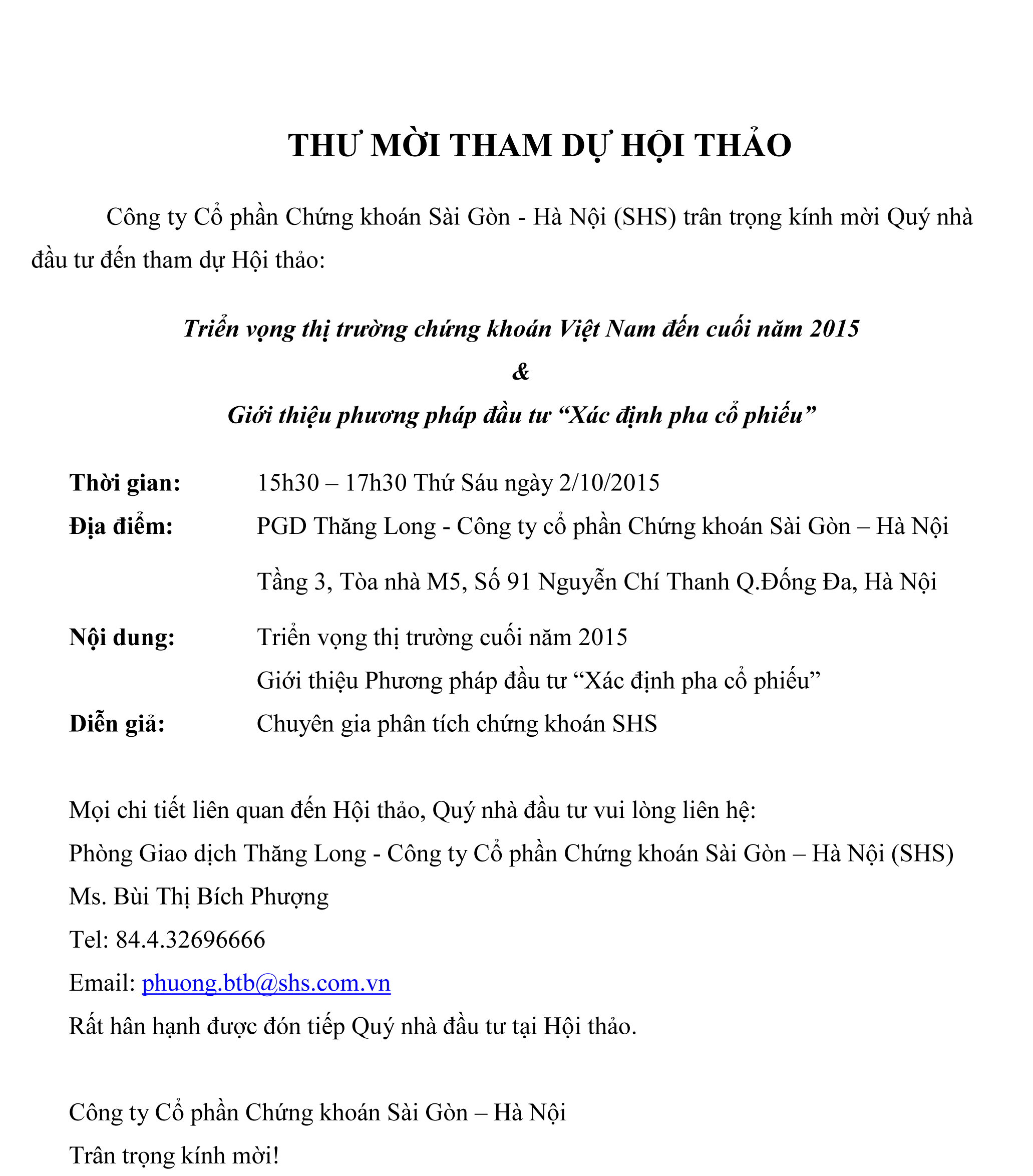 Thư mời tham dự hội thảo về Triển vọng thị trường chứng khoán Việt Nam đến cuối năm 2015 & Giới thiệu phương pháp đầu tư "Xác định pha cổ phiếu"